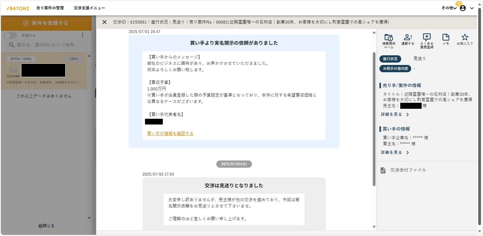 BATONZは、当方の承諾もなく、買い手候補に対して「売主様(当社)が他の交渉を進めている」と虚偽の理由を伝え、お断りしてしまいました。 以下にその事実の証拠となる管理画面のスクリーンショットを提示します。