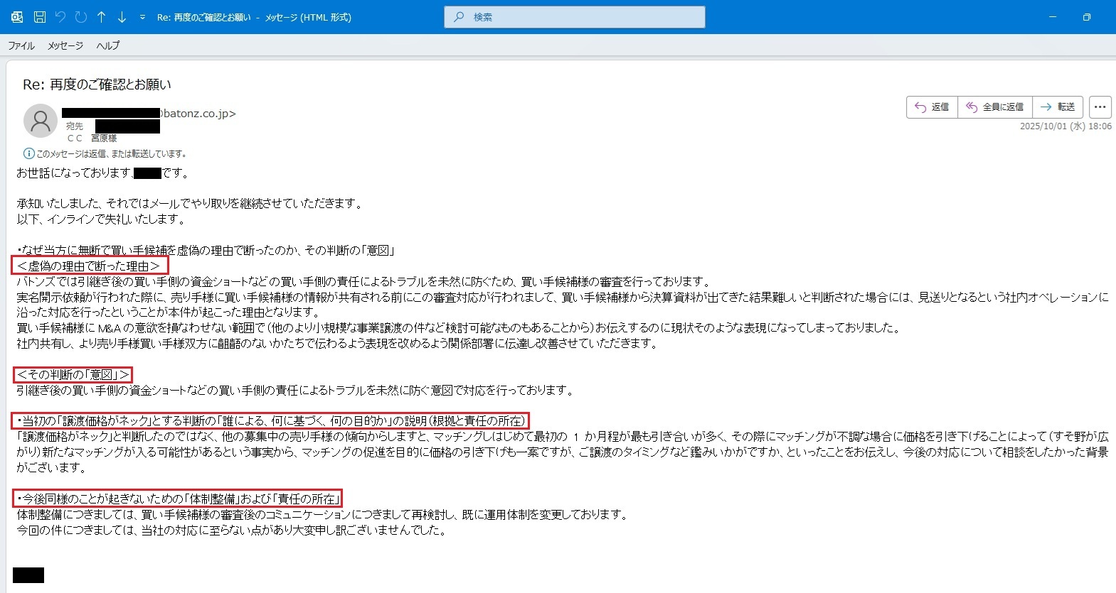 何も言っていないに等しい内容で「虚偽の理由付けで買い手候補を無断で断った」理由になっておらず、 その他の質問に対しても事実上の回答が全くなく、 一般論の繰り返しや責任回避的で不誠実な返答にとどまりました。