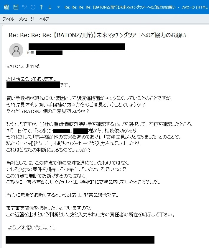 - 2025年9月:2025年7月1日に買い手候補が1人現れたが、7月3日に事実と異なる理由で私たちに無断で断られていたことが、その2か月後に発覚。
