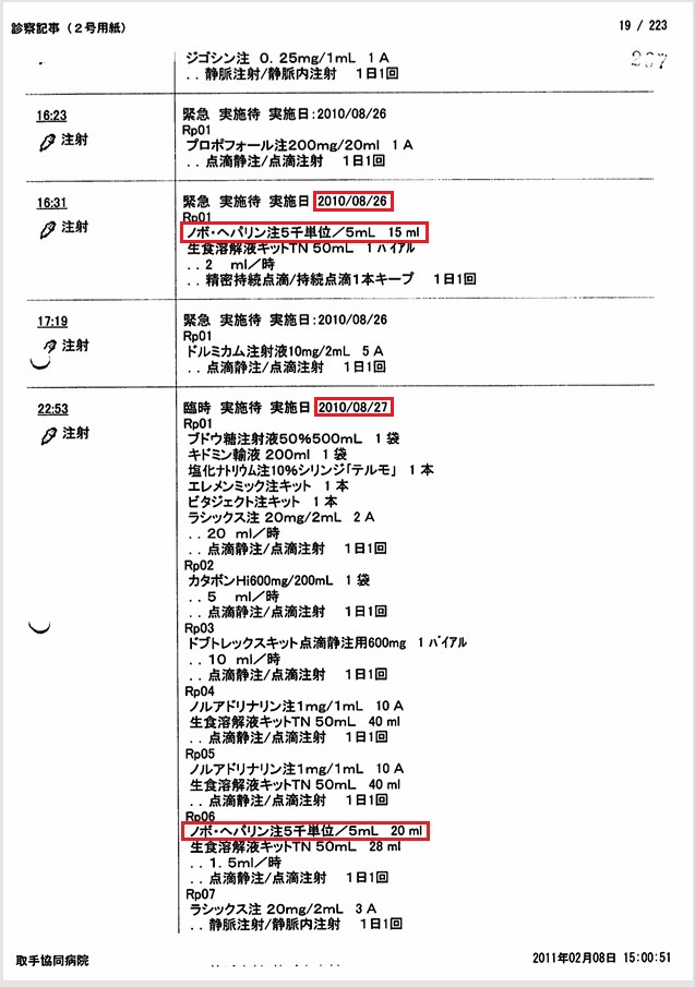 胸腔、心嚢内への出血によるショックの進行中、8月27日の血液検査でAPTT 92秒とパニック値にもかかわらず、ヘパリンを15000単位から20000単位に増量。故意に死期を早めようとした疑い。