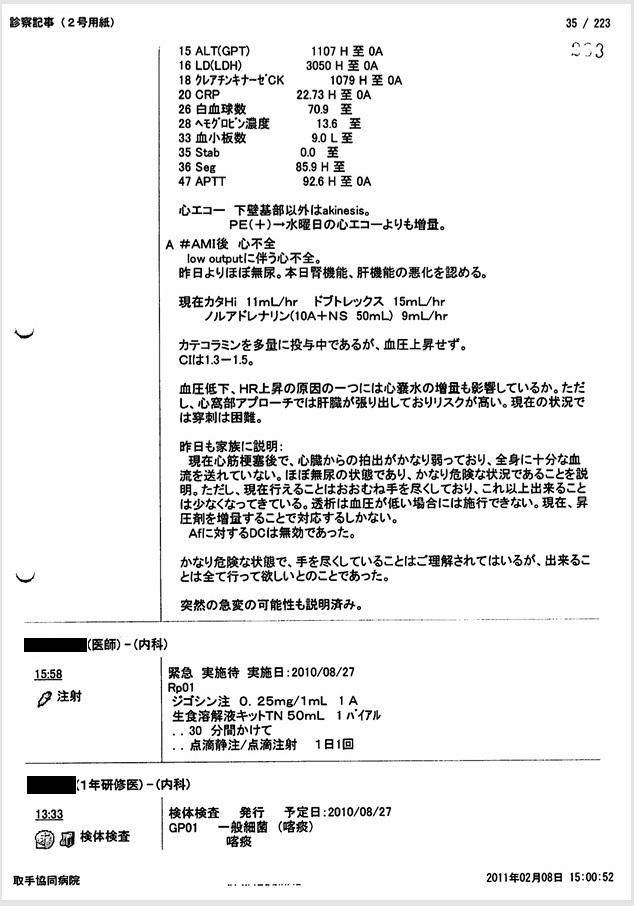 8月27日の午後3時の時点で、血圧60/40 mmHg, 心拍数150~160/min、8時間尿量4mlと、いつ心肺停止してもおかしくない状態であった。 しかし医師は父がショックに陥った原因を「元々の心筋梗塞が重症のため」と偽り、 医療事故とそれに起因する緊張性血胸・心タンポナーデ、出血性ショックを隠蔽した。 またヘパリン15000単位/日が投与されていたが、この日の血液検査でAPTT 92秒とヘパリン投与量が過剰であったにもかかわらず、ヘパリンが20000単位/日に増量されており、故意に死期を早めようとした疑いがある。
