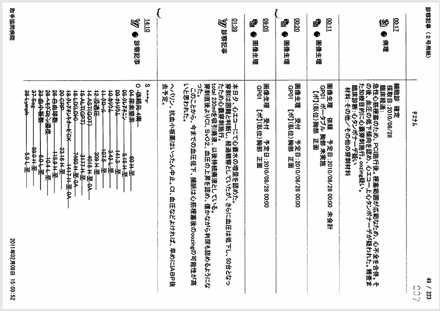 2010年8月分レセプトの検査に「心嚢水」の項目はなく「胸水」のみ。→「心嚢穿刺」という医師説明は虚偽の可能性。
