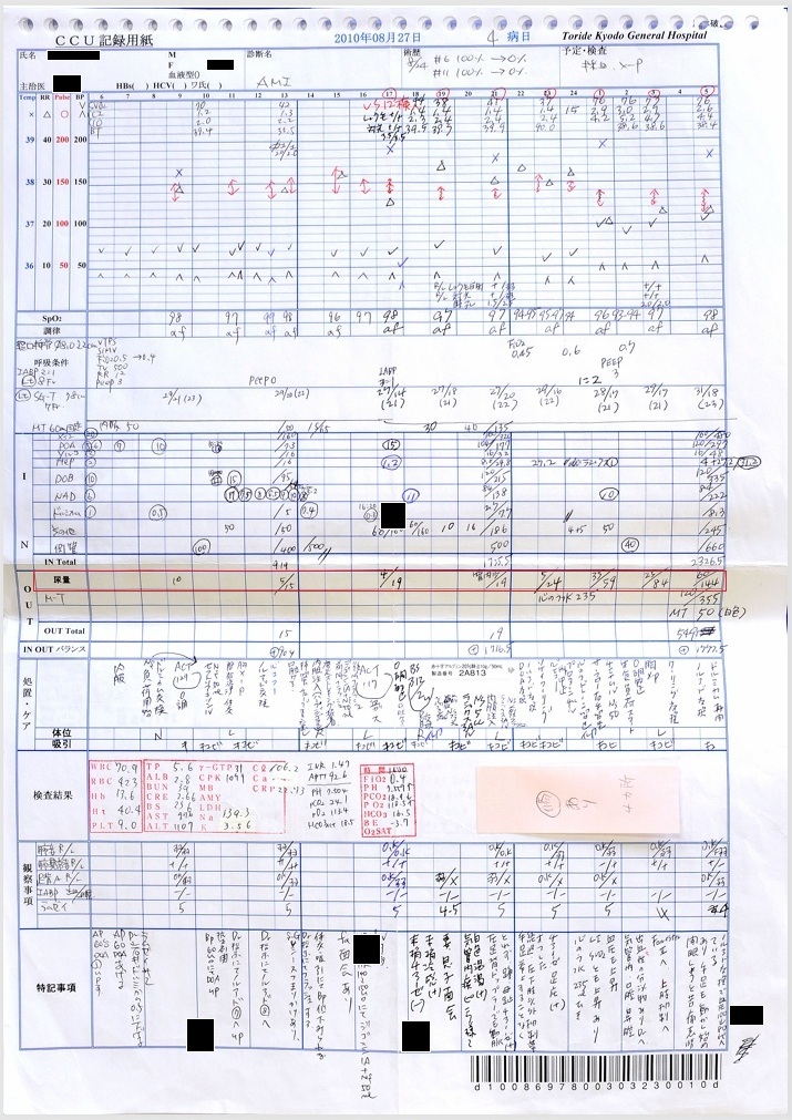 病院から緊急呼び出し。「厳しくなってきました。積極的な治療を希望しますか?」と医師から打診あり。「もちろん希望します」と返答。貧血になっているとのことで輸血開始(貧血の原因について説明なし)。気管挿管、人工呼吸器装着。発症からPCI開始までの時間は短かったため、「この後、必ずよくなる」と私は信じていた。 - 8月27日:重度のショック・危篤状態