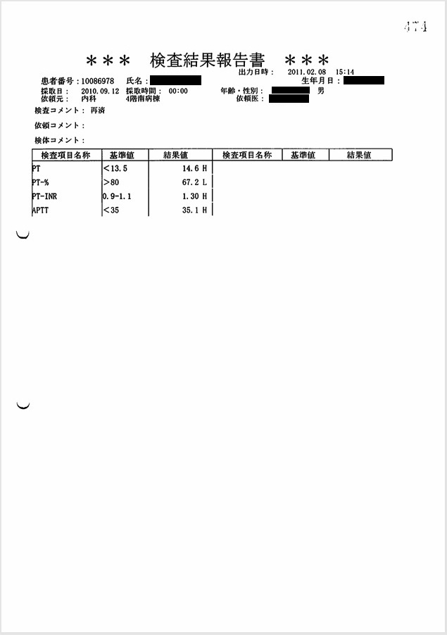 この時、撮影された頭部CTで急性硬膜下血腫が認められた。これが父の直接の死因となった。 医師からもその説明があったが、 直接の原因と推定される「頭部打撲」には一切言及がなく(録音記録あり)、 DIC(播種性血管内凝固)に伴う出血傾向による自然出血とのことだった。 しかしほぼ同時に行われた血液検査では、「PT-INR 1.3, APTT 35 sec, 血小板3.6万/μl」と 出血傾向はごく軽度であり、自然発生的に頭蓋内に出血を起こす可能性は皆無と言ってよい。