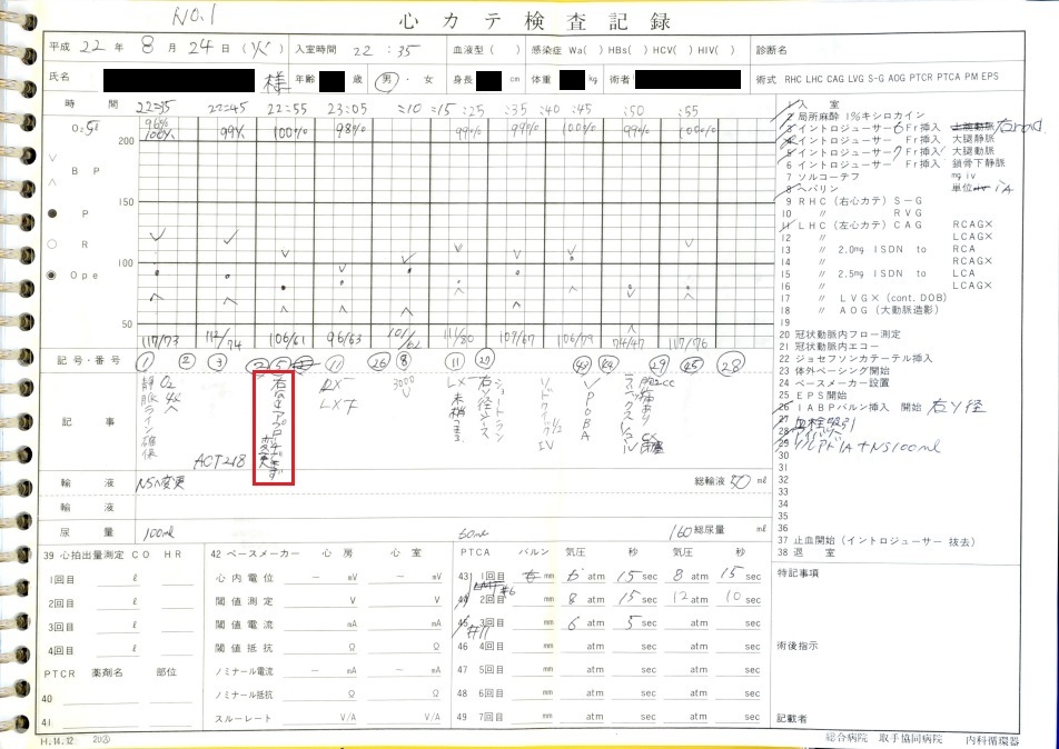 カテーテル治療は22時35分に開始され、右橈骨動脈を穿刺し開始されたが冠動脈へのアプローチに失敗し、右大腿動脈からやり直しとなっている。